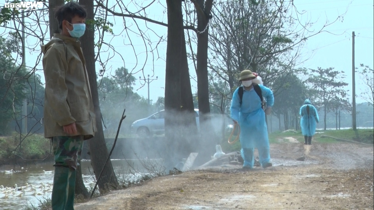 Những hộ dân không có gia cầm mắc bệnh được cán bộ rắc vôi và phun thuốc khử trùng hàng ngày.