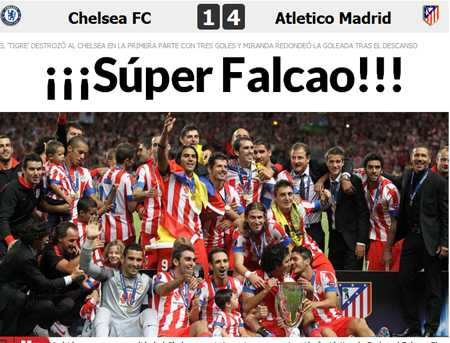 Còn tờ AS lại rút tít: “Siêu Atletico”, đồng thời đưa ra bình luận ngắn: “Atletico đã có chiếc Siêu cúp châu Âu thứ hai sau khi đánh bại Chelsea với tỷ số 4-1. Falcao đã có một trận đấu tuyệt vời với một cú hat-trick. Miranda ghi bàn thắng thứ tư cho Atletico.”