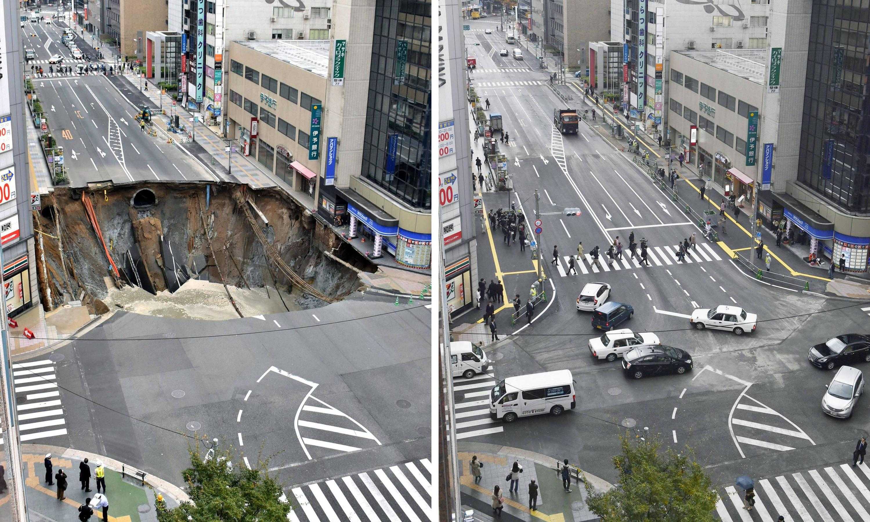 17/11/2016 07:33:00 +07:00Chỉ sau 48 giờ, hố tử thần rộng tới 30m đã được san lấp, sửa chữa, đoạn đường mới thậm chí còn bền gấp 30 lần so với công trình ban đầu; tuy nhiên, chính quyền Nhật Bản vẫn xin lỗi người dân vì những bất tiện mà họ gặp phải trong những ngày vừa qua.