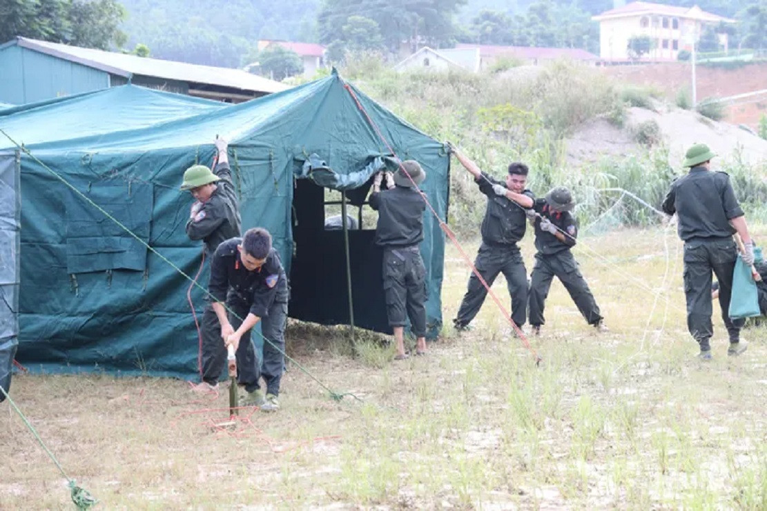 Lực lượng chức năng dựng lều dã chiến, chuẩn bị di dời 115 người dân thôn Kho Vàng xuống nơi an toàn. (Ảnh: Báo Lào Cai)