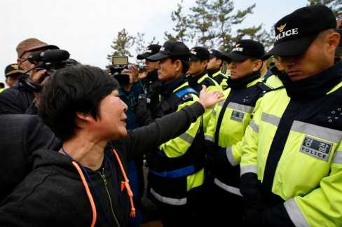 | Cảnh sát ngăn cuộc biểu tình giận dữ của phục huynh các học sinh mất tích trên chuyến phà tử thần. |