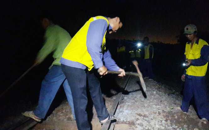 | Anh em Đội Quản lý đường sắt Bình Thuận (thuộc Công ty Quản lý đường sắt Sài Gòn) gia cố lại đoạn đường ray bị hất văng khỏi hệ thống đường ray lúc 0g15 sáng 30-9 - Ảnh: NGUYỄN NAM |
