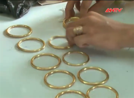 Khám xét nhanh trong người cả hai, phát hiện rất nhiều vòng vàng loại 24K cùng nhiều biên nhận cầm đồ của các tiệm vàng trong khu vực.Thượng tá Mai Trường Sơn - Phó trưởng Công an huyện Trần Văn Thời cho biết, các đối tượng thường mang những vòng vàng này đến các tiệm vàng và dùng các lý do đây là vòng cưới hoặc được nhà chồng tặng để tạo niềm tin ở những người mua vàng.