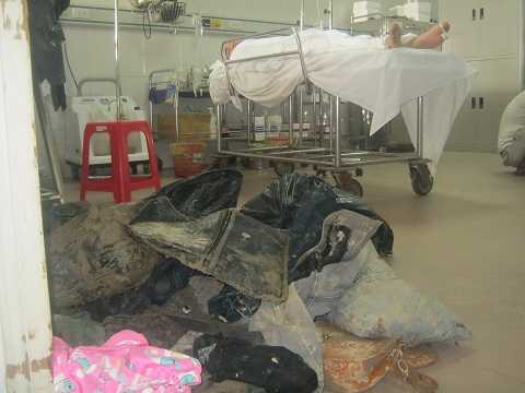 | Trong phòng cấp cứu nạn nhân nằm bất động, trước cửa phòng những bộ quần áo dính đầy bùn đất |
