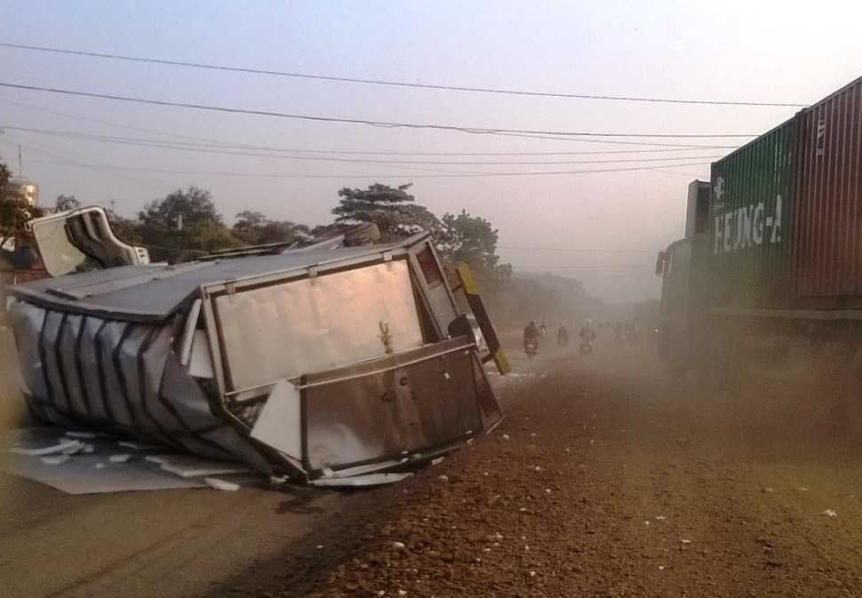 Hiện trường chiếc xe tải chở bí đao bị lật ngang trên quốc lộ 14Thông tin ban đầu, vào khoảng 2h sáng (cùng ngày) chiếc xe tải chở hàng trăm thùng bí đao lưu thông trên QL14, theo hướng Bình Dương đi Đăk Nông, khi đến địa điểm trên, gặp đoạn đường hư hỏng xuống cấp, chiếc xe tải bị lật.