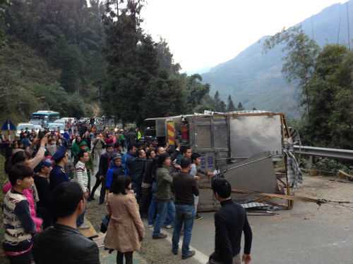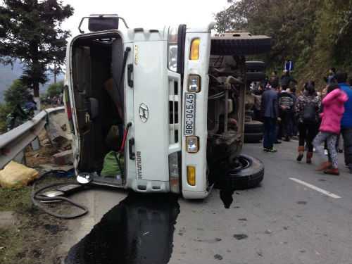 | Chiếc xe tải lật giữa đường. Ảnh: Otofun |