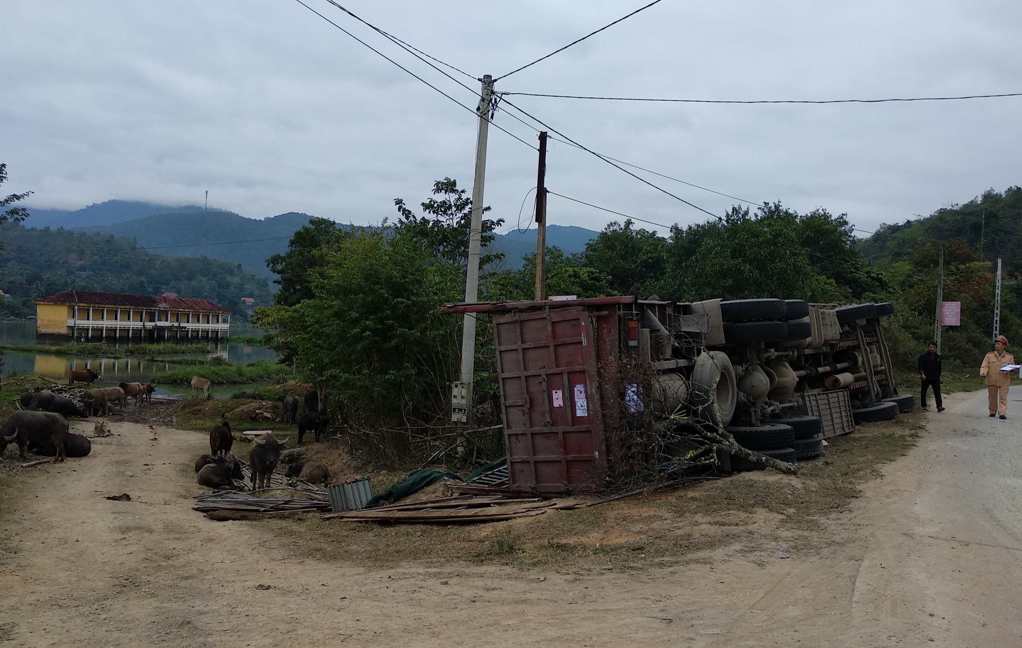 Xe tải bị lật, hàng chục con trâu rơi xuống đường.