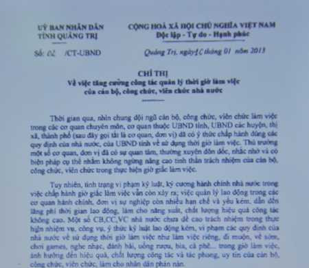 Để chấn chỉnh kỷ cương hành chính, nâng cao ý thức trách nhiệm và hiệu quả hoạt động công vụ, UBND tỉnh Quảng Trị vừa ban hành chỉ thị 02 (ngày 10/1/2013) về việc tăng cường công tác quản lý thời gian làm việc của cán bộ, công chức, viên chức (CB,CC,VC) nhà nước. |
