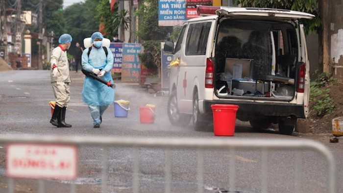 Phun khử khuẩn toàn bộ thôn Hạ Lôi, huyện Mê Linh, Hà Nội sau khi phát hiện ca bệnh số 243. (Ảnh: KTĐT)