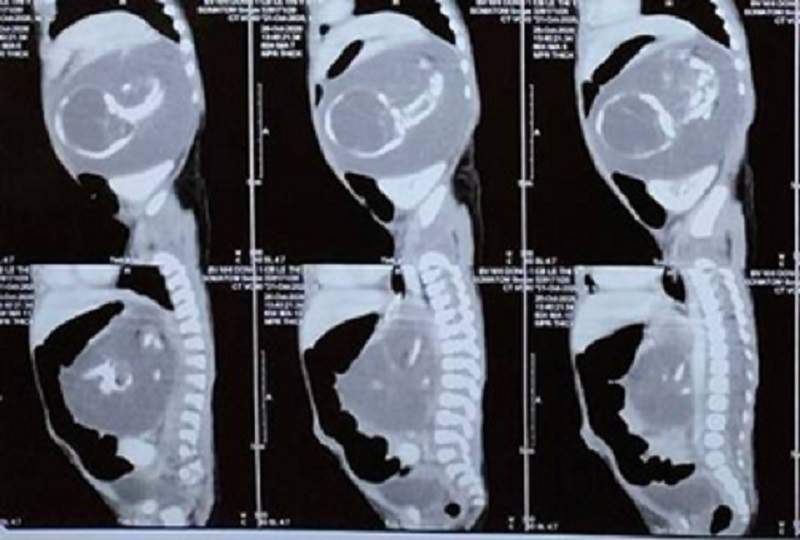 Qua siêu âm và CT-Scan ghi nhận một khối hỗn hợp trong bụng, nằm sau phúc mạc trái, kích thước 5,3cm x 8,1cm. Khối u to có mô mỡ, cột sống, hộp sọ, xương dài đẩy thận xuống vùng hố chậu, đẩy tụy ra trước. Bác sĩ chẩn đoán dây là trường hợp “thai trong thai” và chỉ định phẫu thuật.