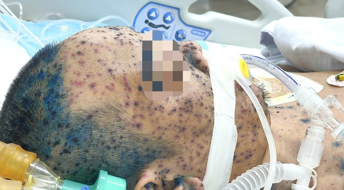 ThS.BS Phạm Văn Phúc, Phó Giám đốc Trung tâm Hồi sức tích cực cho biết, bệnh nhân nhập viện trong tình trạng nhịp tim nhanh, suy hô hấp nặng, tổn thương phổi lan tỏa, phải an thần thở máy với thông số ô xy 100%. Người bệnh kèm rối loạn đông máu, hội chứng nhiễm trùng nặng, toàn thân xuất hiện nhiều mụn nước, mụn mủ kích thước không đều.