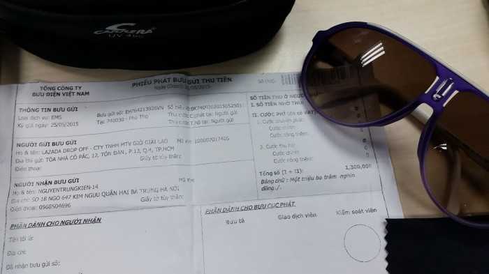 Anh Kiên - một khách hàng khác cũng bức xúc vì anh có đặt mua một chiếc kính thời trang hiệu Carrera trên website: www.lazada.vn. Thế nhưng, kính là hiệu Carrera nhưng giẻ lau mắt kính thì lại in chữ Emporio Armani…