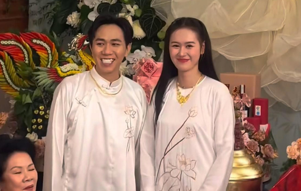 Trong ngày ra mắt gia đình nhà vợ, Anh Đức mặc áo dài trắng chất liệu lụa. Cô dâu diện trang phục truyền thống ton-sur-ton với chồng, để tóc xõa đơn giản. Suốt quá trình diễn ra buổi lễ, Quỳnh Anh liên tục có cử chỉ quan tâm Anh Đức.