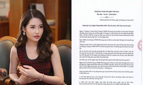 Trước đó, ngày 17/12, công ty TNHH Thương mại và Dịch vụ Hoa hậu Thế giới đã nhận được công văn từ chối cấp phép cho Lê Âu Ngân Anh của cục NTBD.
