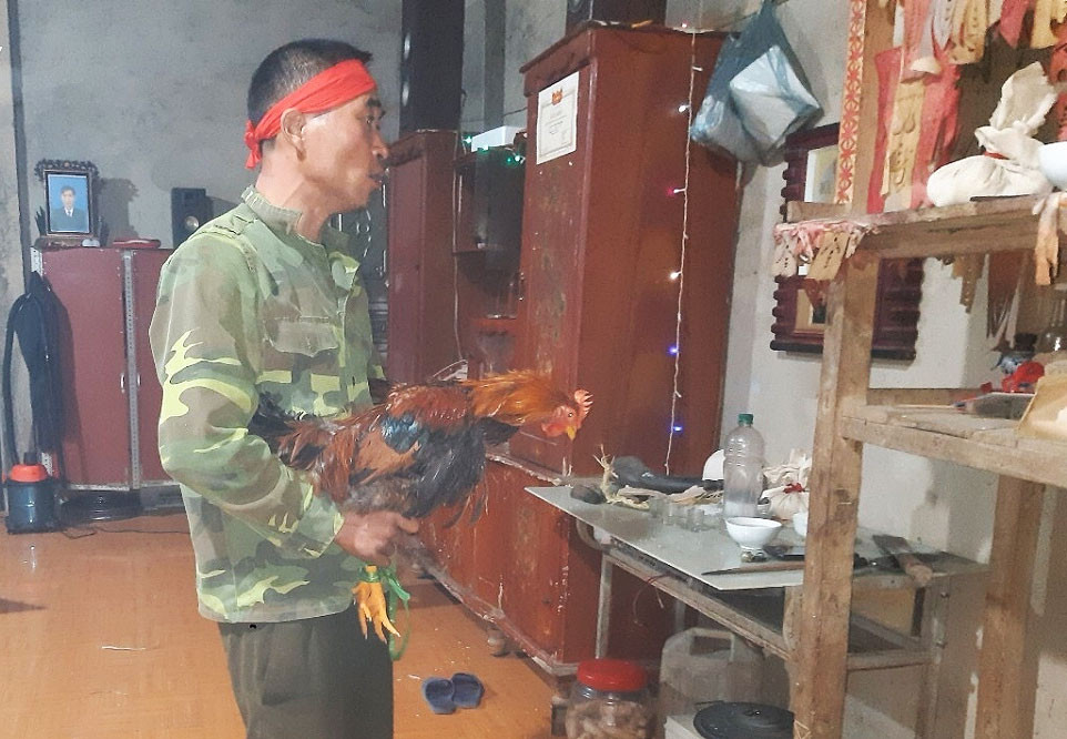 Thầy cúng chuẩn bị máu từ mào gà trống to khỏe để tiếp sức cho phần hồn vía bị lưu lạc.