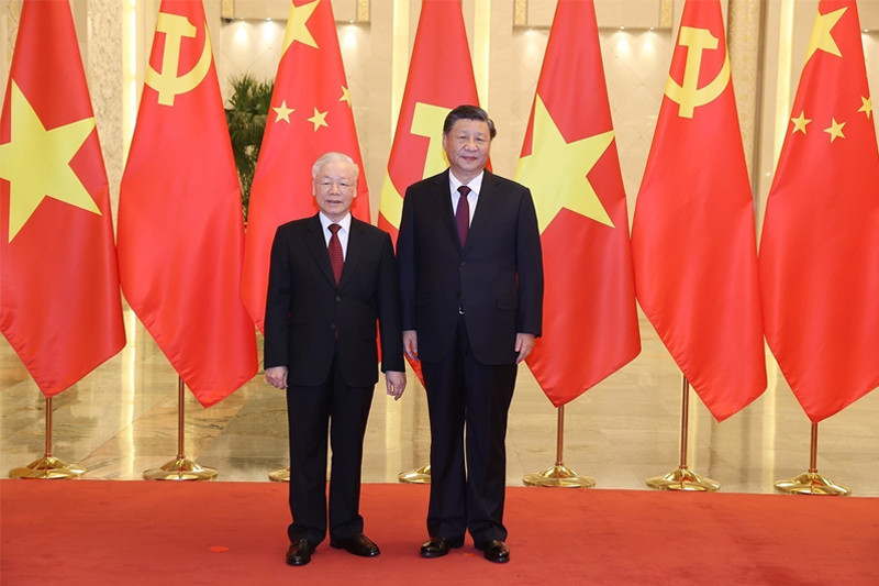 Tổng Bí thư, Chủ tịch Trung Quốc Tập Cận Bình và Tổng Bí thư Nguyễn Phú Trọng trên bục danh dự.