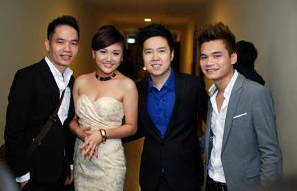 | Hai người chụp ảnh chung với Khắc Việt và Quang Cường |