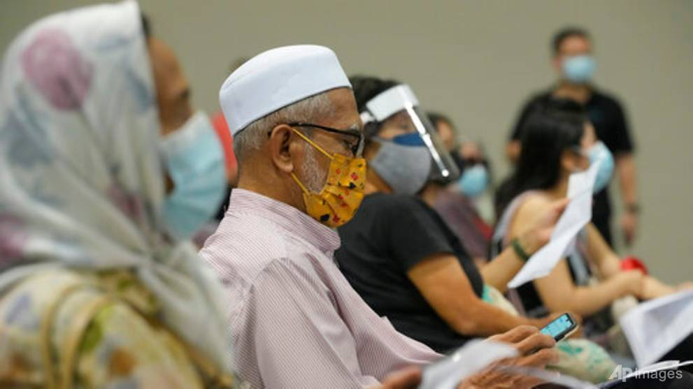 Cư dân đeo khẩu trang chờ tiêm vaccine Pfizer tại Malaysia. (Ảnh: AP)