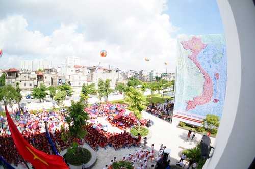 | Bức tranh bản đồ Việt Nam được tạo bởi bàn tay của 2.500 học sinh trong trường chính là hành trang tinh thần đầu tiên khi các em học sinh đến với Vinschool trong niềm mong muốn làm nên những điều kì diệu, đúng như ca từ ý nghĩa của bài hát “Bàn tay kì diệu” |