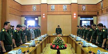 | Các đại biểu dự cuộc họp tại Bộ Quốc phòng dành phút mặc niệm Đại tướng Võ Nguyên Giáp. |