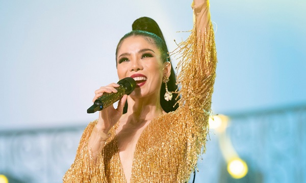 Khoác trên mình bộ đầm màu hồng lộng lẫy, nữ ca sĩ mang đến 2 nhạc khúc nổi tiếng của tác giả Hoàng Hiệp là “Nhớ về Hà Nội” và “Mùa chim én bay” như một cách đưa khán giả ngược về thời tuổi thơ của cô.
