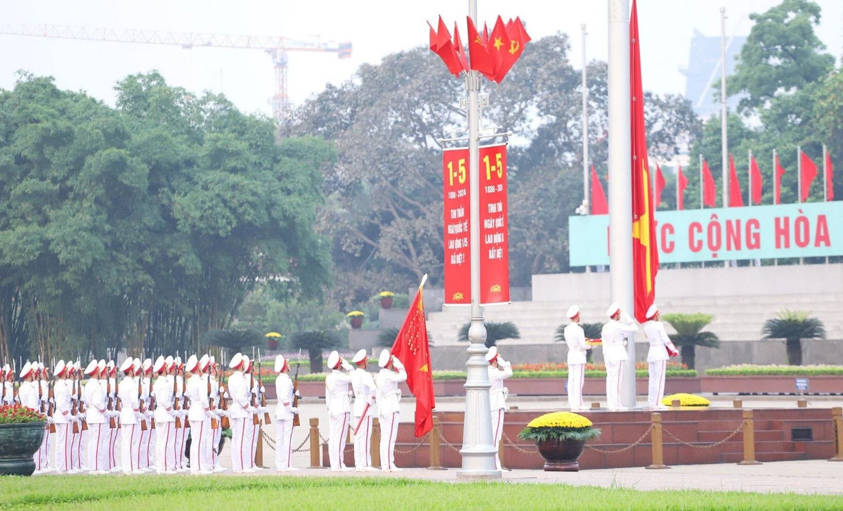 Đúng 6h, nghi thức được cử hành, đội tiêu binh danh dự gồm 34 người tượng trưng cho 34 chiến sỹ đầu tiên của Đội Việt Nam Tuyên truyền Giải phóng quân tiến vào khuôn viên Quảng trường Ba Đình.