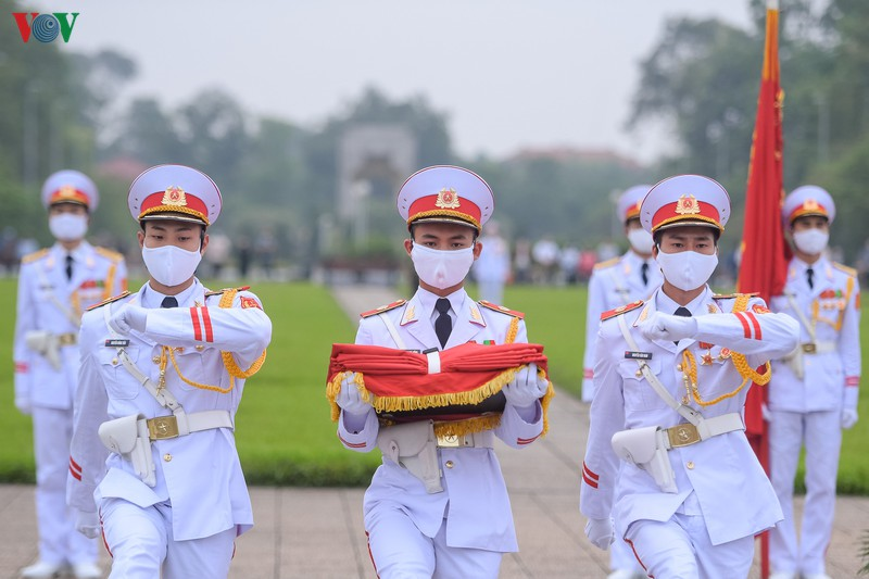Đoàn hành lễ khởi hành từ phía sau Lăng Chủ tịch Hồ Chí Minh. Dẫn đầu đoàn là quân kỳ Quyết thắng.