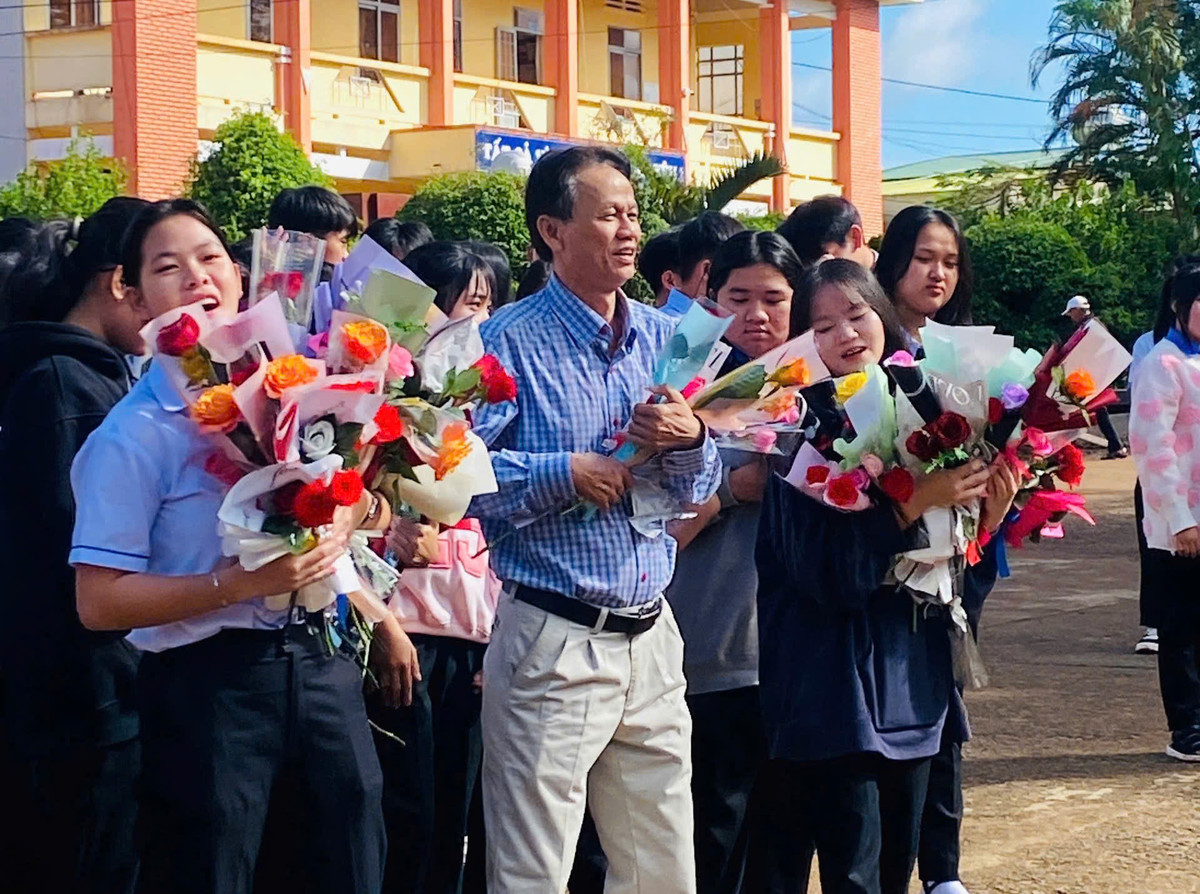 “Học sinh toàn trường tổ chức lễ về hưu khiến tôi rất bất ngờ. Khoảng khắc toàn thể giáo viên và học sinh hô vang tên, tôi lắng đọng và cố gắng nén lại nước mắt. Giờ tan trường, tôi đứng trước cổng chào các em, khi đó tôi đã khóc”, thầy hiệu trưởng Hoàng Minh Ngọc (huyện Ea H'leo, tỉnh Đắk Lắk) chia sẻ.