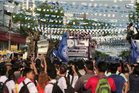 (VTC News) - Sau khi đăng quang ngôi vô địch Premier League 2015/16, Leicester City đang mang cúp đến thủ đô Bangkok (Thái Lan) để ăn mừng cùng người hâm mộ xứ Chùa vàng. Hàng vạn người Thái Lan đã đổ ra đường chung vui với thầy trò Ranieri.