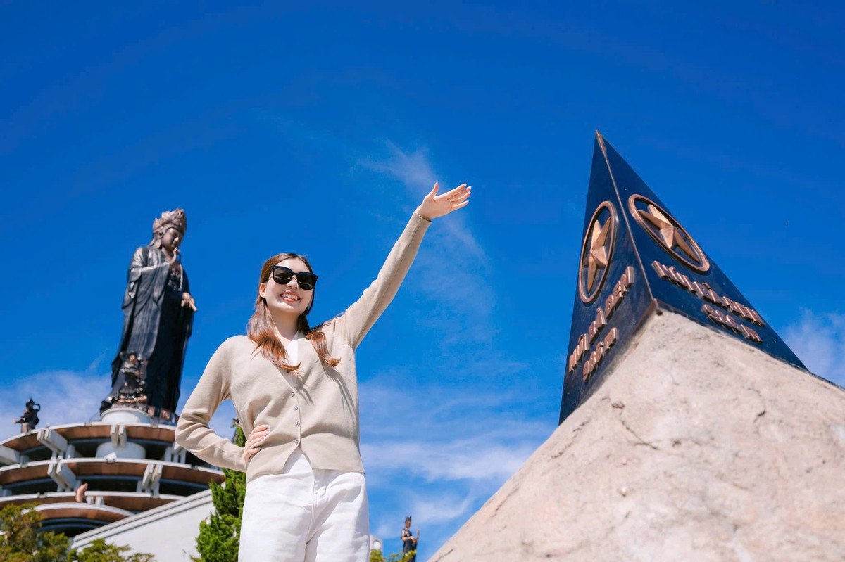 Bạn trẻ check-in bên cột mốc núi Bà Đen.