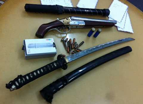 | Các loại vũ khí thu được tại nhà đối tượng Long |