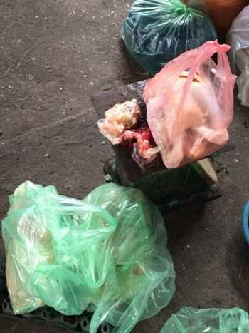 Gà trống hay gà mái đã được mổ sẵn đều được chị S. bán với giá 100.000 đồng/kg, bằng với giá gà sống chưa giết. Chỉ có điều, mỗi con gà đều được cân cùng cả tiết và bộ lòng mề đi kèm, cộng thêm với 2 lạng do hao hụt từ phần lông đã bỏ đi. Nhìn kỹ trên khắp con gà đã giết mổ không có một cái dấu kiểm dịch nào cả.