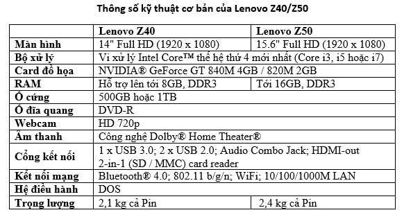 Để có được điều đó, Lenovo đã ưu ái trang bị cho Z40/Z50 rất nhiều tính năng mạnh mẽ, không chỉ về màn hình mà còn âm thanh, khả năng xử lý đồ họa cao cấp và hiệu năng hệ thống ấn tượng. Với vi xử lý Intel Core thế hệ thứ tư mới nhất, card đồ họa cực mạnh GeForce GT 820M 2GB (Z40) hoặc GeForce GT 840M 4GB (Z50) và âm thanh cao cấp Dolby Home Theater, Lenovo đã biến Z40/Z50 thành cỗ máy giải trí di động thực sự đáng giá.