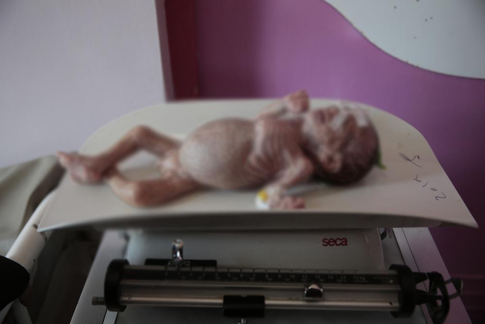Một bé gái da bọc xương ngồi trong chậu nhựa để cân tại trạm y tế ở Yemen. (Ảnh: AP)