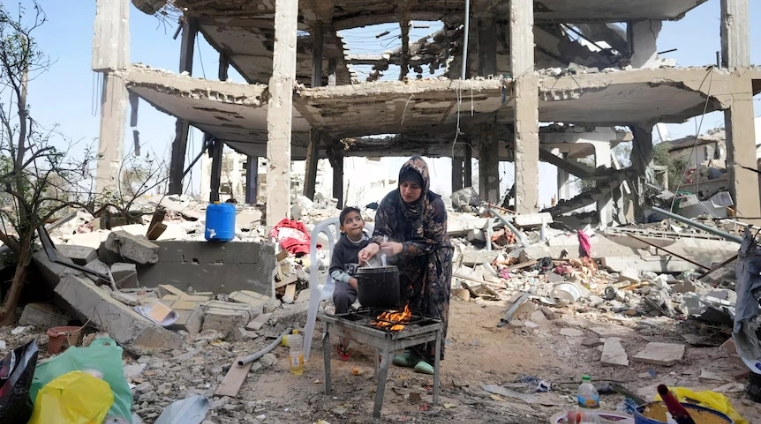 Một người phụ nữ Palestine nấu ăn trước tòa nhà đồ nát ở Dải Gaza. (Ảnh: AP)