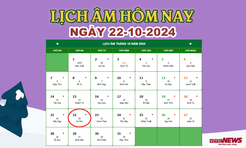 Xem lịch âm hôm nay ngày 22/10/2024.