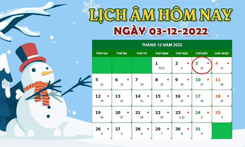 Dương lịch hôm nay là 3/12/2022, tương ứng với lịch âm là ngày 10/11.
