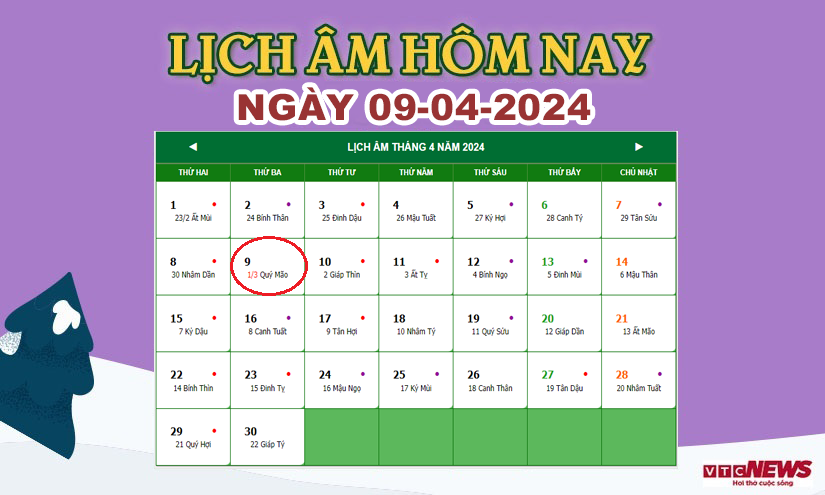 Xem lịch âm hôm nay ngày 9/4/2024.