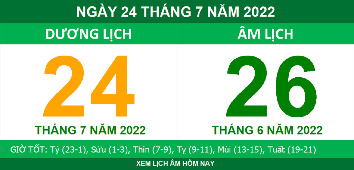 Lịch âm hôm nay là ngày mấy? Dương lịch hôm nay là 24/7/2022, tương ứng với lịch âm là ngày 26/6.