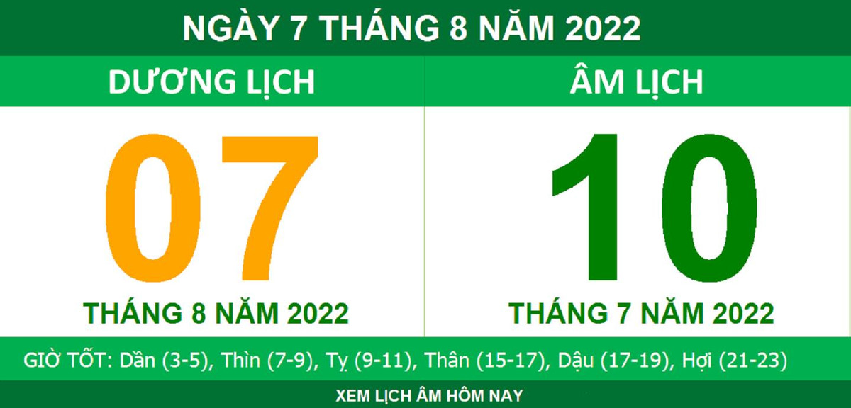 Lịch âm hôm nay là ngày mấy? Dương lịch hôm nay là 7/8/2022, tương ứng với lịch âm là ngày 10/7.