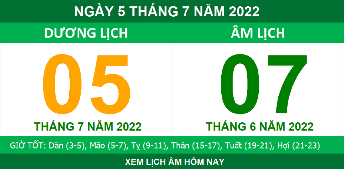 Lịch âm hôm nay là ngày mấy? Dương lịch hôm nay là 5/7/2022, tương ứng với lịch âm là ngày 7/6.