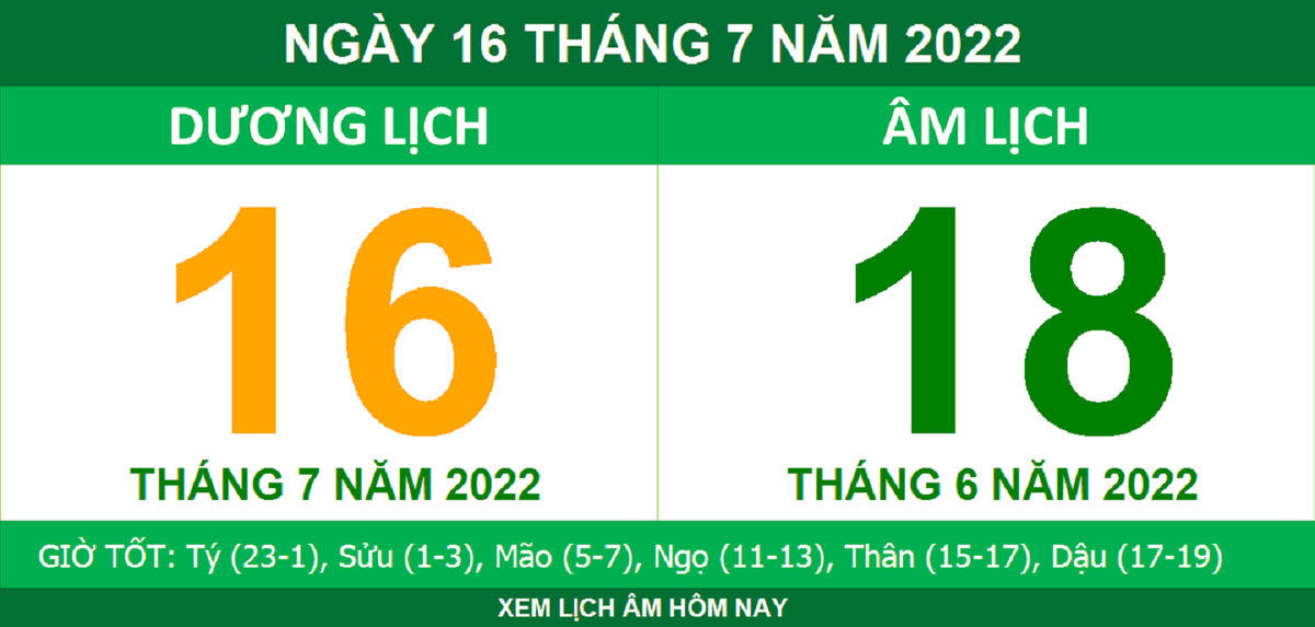 Lịch âm hôm nay là ngày mấy? Dương lịch hôm nay là 16/7/2022, tương ứng với lịch âm là ngày 18/6.