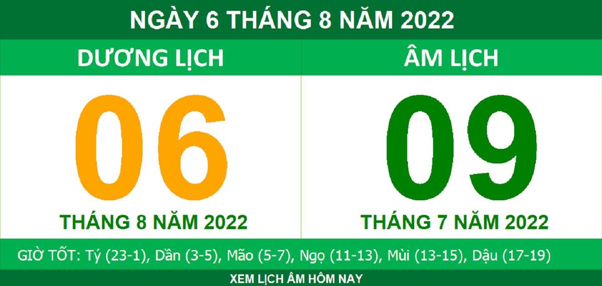 Lịch âm hôm nay là ngày mấy? Dương lịch hôm nay là 6/8/2022, tương ứng với lịch âm là ngày 9/7.