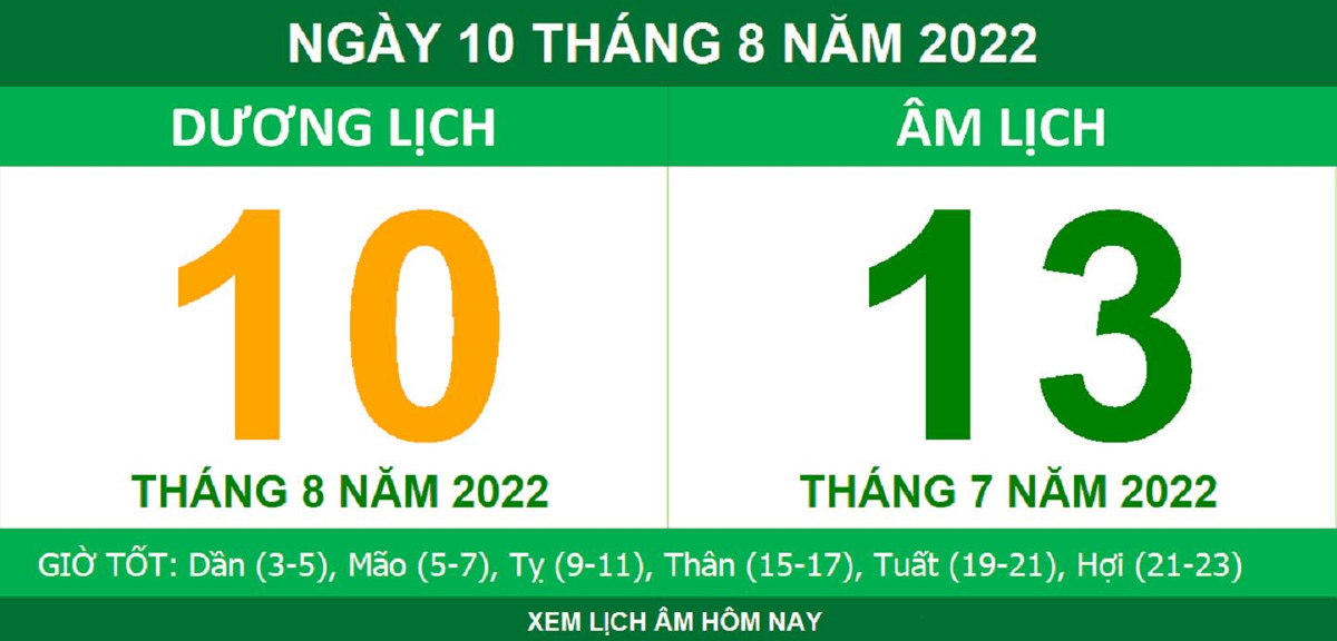 Lịch âm hôm nay là ngày mấy? Dương lịch hôm nay là 10/8/2022, tương ứng với lịch âm là ngày 13/7.
