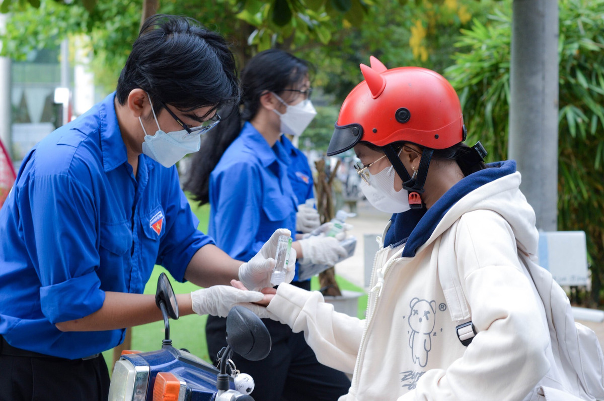 Sinh viên khử khuẩn phòng chống dịch COVID-19 trở lại.