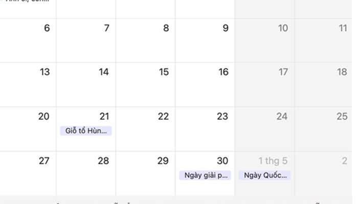 Sau Tết Nguyên đán, ngày Giỗ Tổ Hùng Vương (10/3 âm lịch), ngày Giải phóng miền Nam, thống nhất đất nước 30/4 và Quốc tế lao động 1/5 là các dịp nghỉ lễ tiếp theo trong năm.