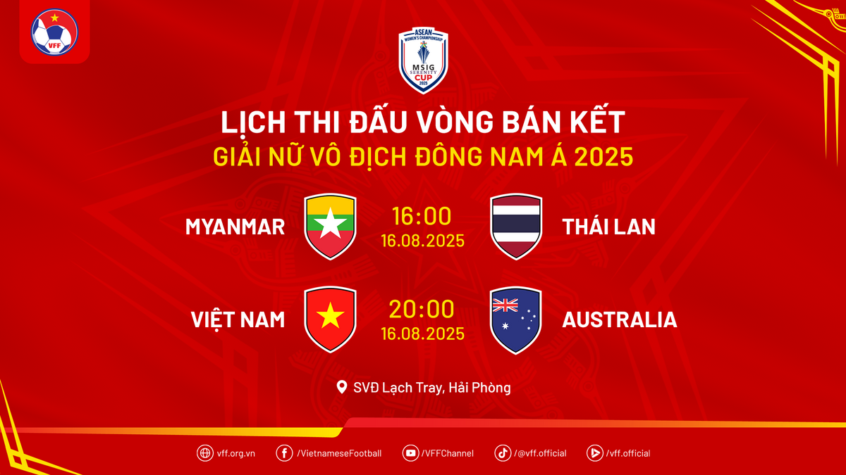 Vòng bán kết ASEAN Cup nữ 2025 diễn ra ngày 16/8. Toàn bộ các trận đấu còn lại của giải diễn ra trên sân vận động Lạch Tray (Hải Phòng).