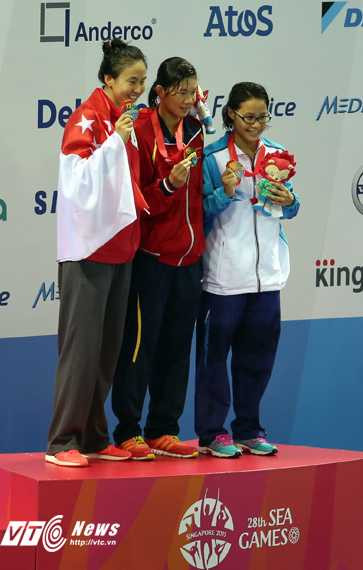 | Ánh Viên hạnh phúc trên bục nhận huy chương |