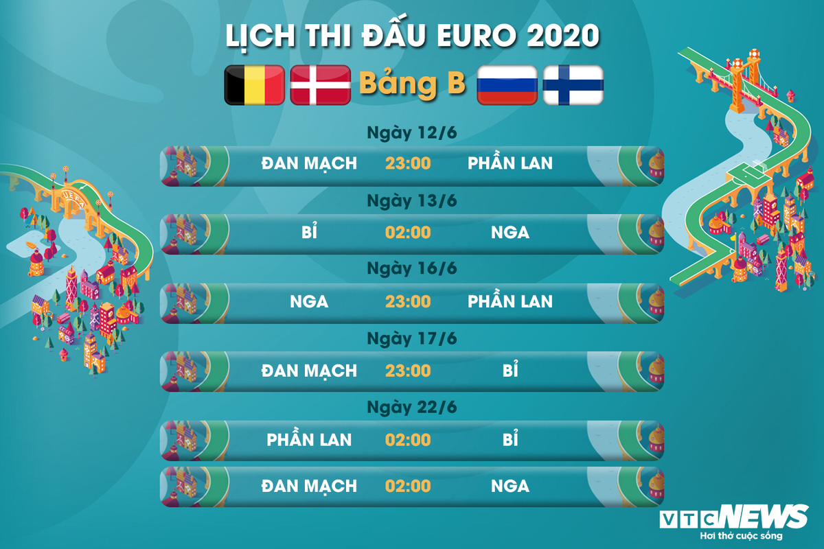 Đan Mạch, Phần Lan, Bỉ và Nga là 4 đội bóng góp mặt ở bảng B của EURO 2020. Bảng đấu này diễn ra tại 2 sân vận động là Parken ở Copenhagen (Đan Mạch) và Krestovsky ở Saint Petersburg (Nga).