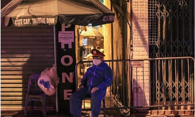 Lực lượng chức năng phong tỏa nơi bệnh nhân COVID-19 thứ 10 của Hà Nội đang sống. (Ảnh: SKDS).